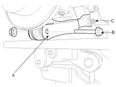 10. Install the mounting bolt (B) of the rear lower arm (A) and the rear carrier with a specified torque, while supporting the lower arm (A) with a jack as shown in the illustration. Tighten the mounting bolt (C) of the cross member and the rear lower arm with a specified torque.