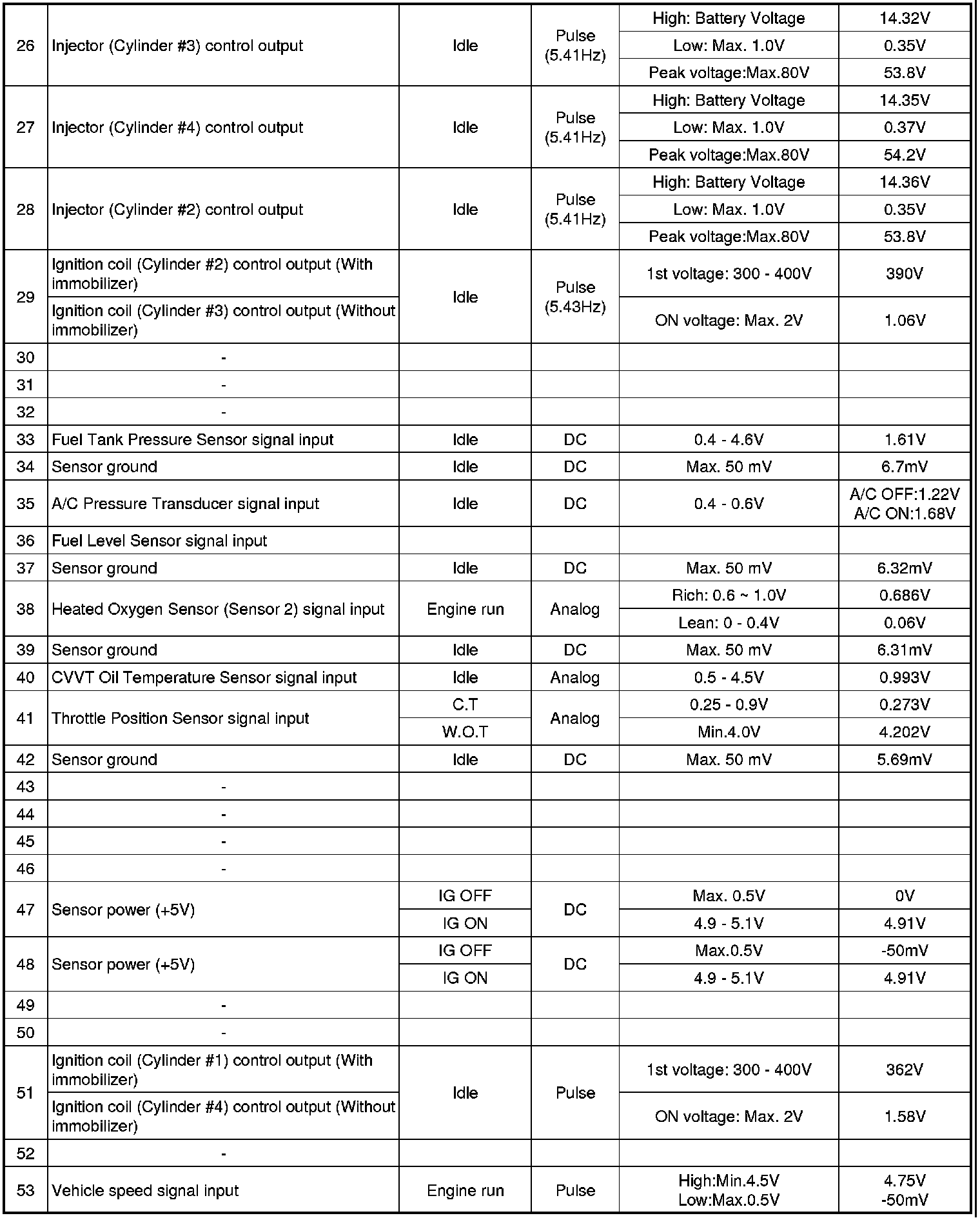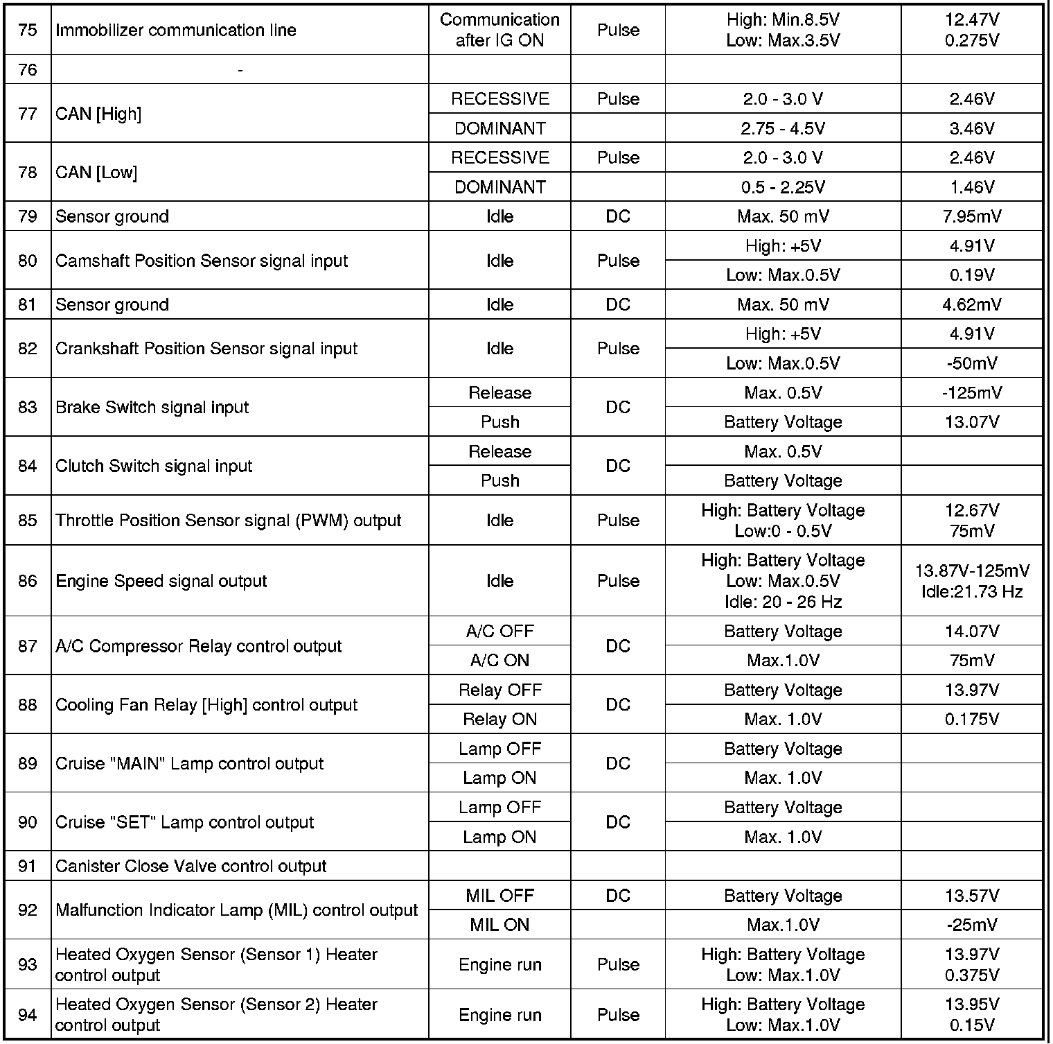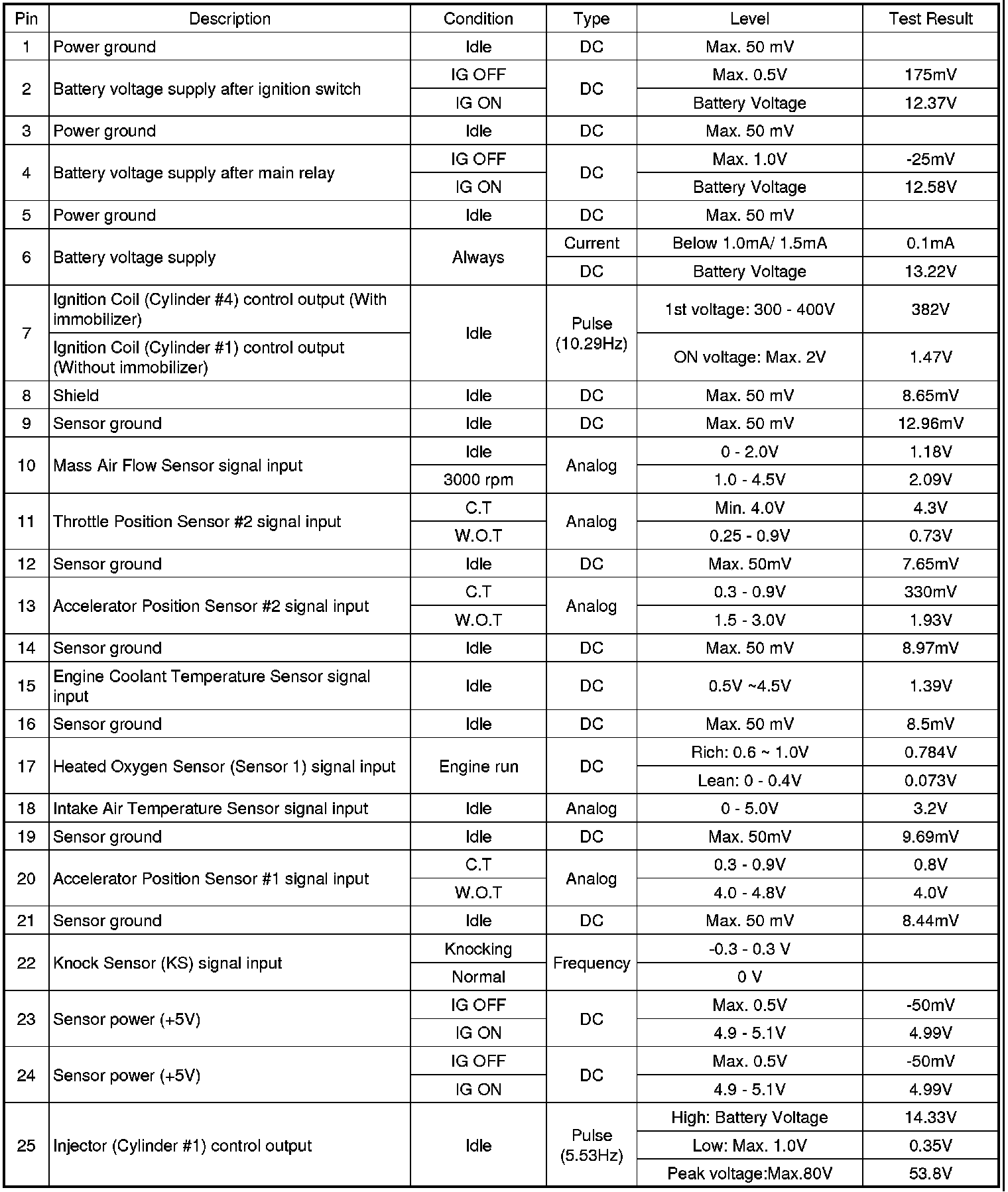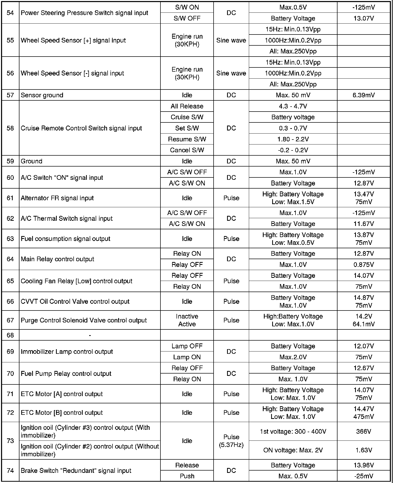 Pinout Values and Diagnostic Parameters