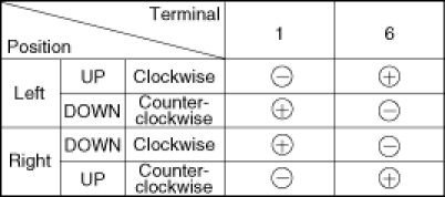 4. Connect the motor terminals directly to battery voltage (12V) and check that the motor operates smoothly. Next, reverse the polarity and check that the motor operates smoothly in the reverse direction. If the operation is abnormal, replace the motor.