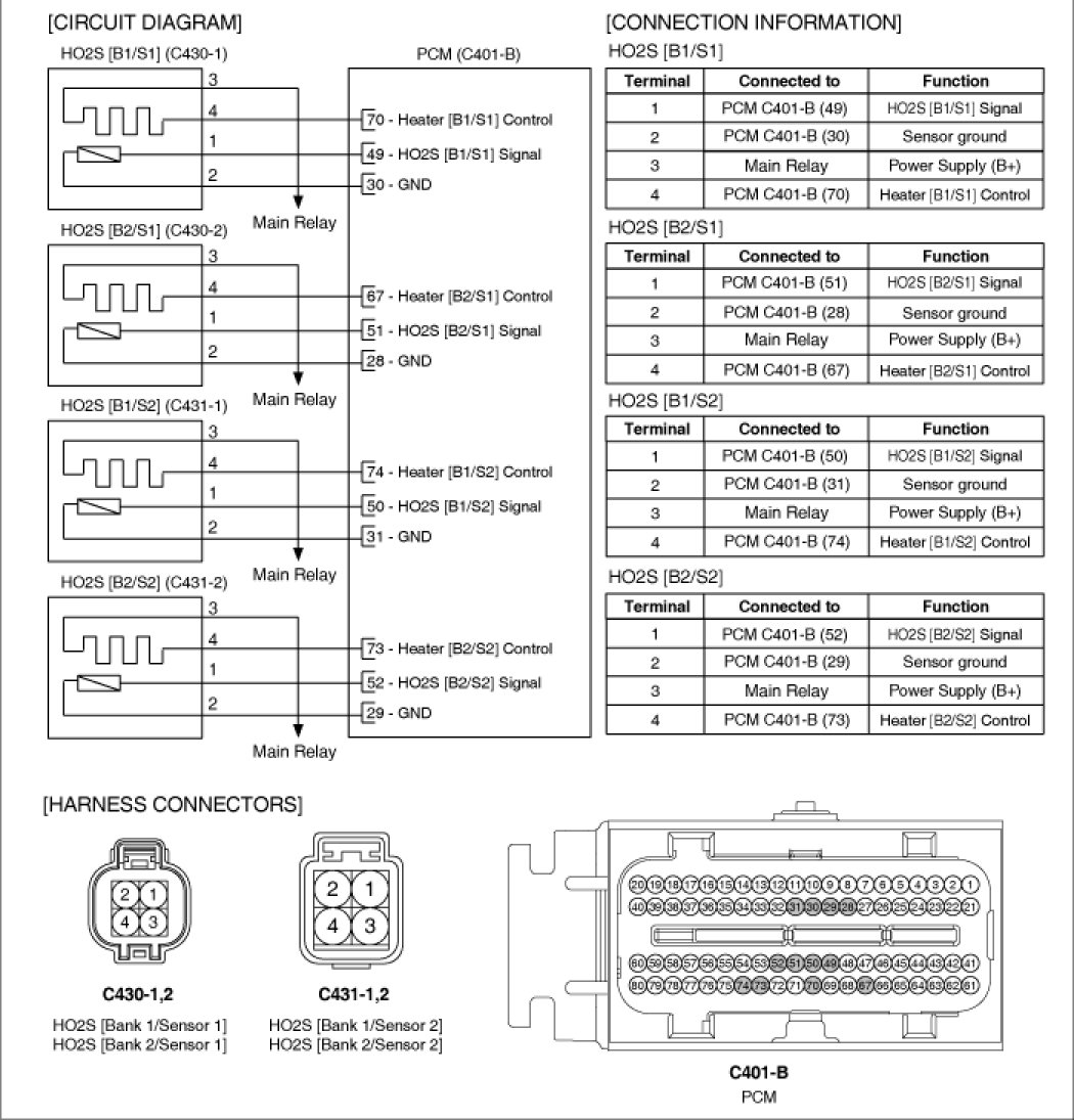 Heated Oxygen Sensor (HO2S) consists of zirconium and alumina and is installed upstream and downstream of the Manifold Catalyst Converter (MCC). After it compares oxygen consistency of the atmosphere with the exhaust gas, it transfers the oxygen consistency of the exhaust gas to the PCM. When A/F ratio is rich or lean, it generates approximately 1V or 0V respectively. In order that this sensor normally operates, the temperature of the sensor tip is higher than 370°C (698°F). So it has a heater which is controlled by the PCM duty signal. When the exhaust gas temperature is lower than the specified value, the heater warms the sensor tip.