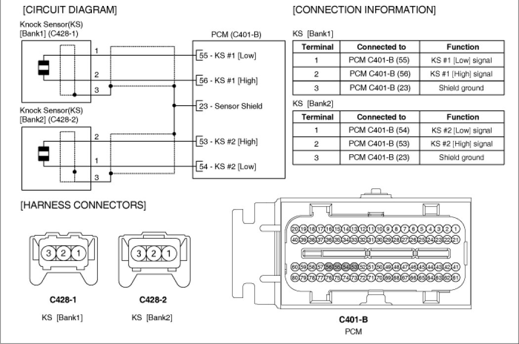 Knocking is a phenomenon characterized by undesirable vibration and noise and can cause engine damage. Knock Sensor (KS) senses engine knocking and the two sensors are installed inside the V-valley of the cylinder block. When knocking occurs, the vibration from the cylinder block is applied as pressure to the piezoelectric element. At this time, this sensor transfers the voltage signal higher than the specified value to the PCM and the PCM retards the ignition timing. If the knocking disappears after retarding the ignition timing, the PCM will advance the ignition timing. This sequential control can improve engine power, torque and fuel economy.