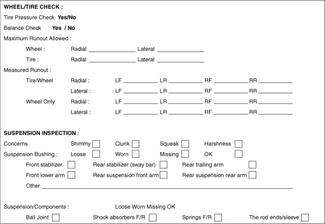 To assist the service advisor and the technician, check the suspension and wheel/tire condition with the questions listed below by filling them. It serves as a place to record information as well as data from the testing to be carried out. To begin a successful diagnosis, fill out the questions.