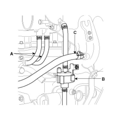 6. Disconnect the heater hose(A), plug control solenoid valve(PCSV) hose(B) and the brake booster hose from the intake manifold and throttle body assembly(C).