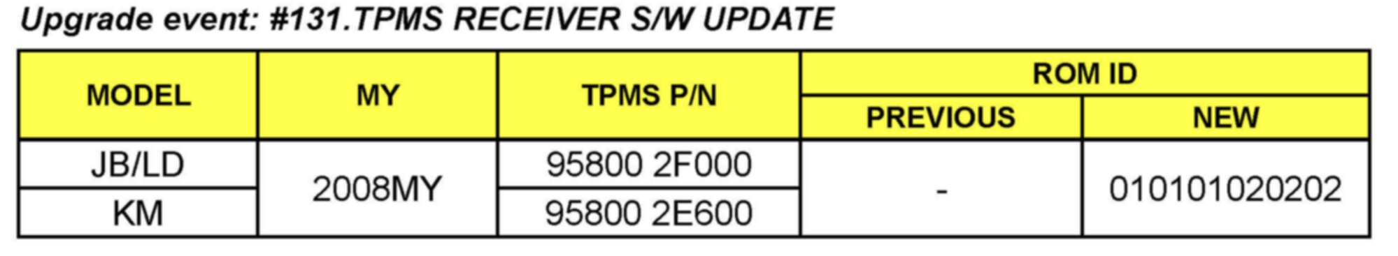 KMA is conducting a Service Action in relation to some 2008MY Sportage (KM), Spectra (LD), Rio (JB) vehicles with "low-line" Tire Pressure Monitoring System (TPMS). See Production Date Range Chart. Some vehicles may experience illumination of the TPMS warning lamp indicating that there is a problem with the TPMS system. This bulletin provides information relating to Tire Pressure Monitoring System (TPMS) receiver software upgrade for these vehicles. The upgrade procedure as outlined below will correct this condition.