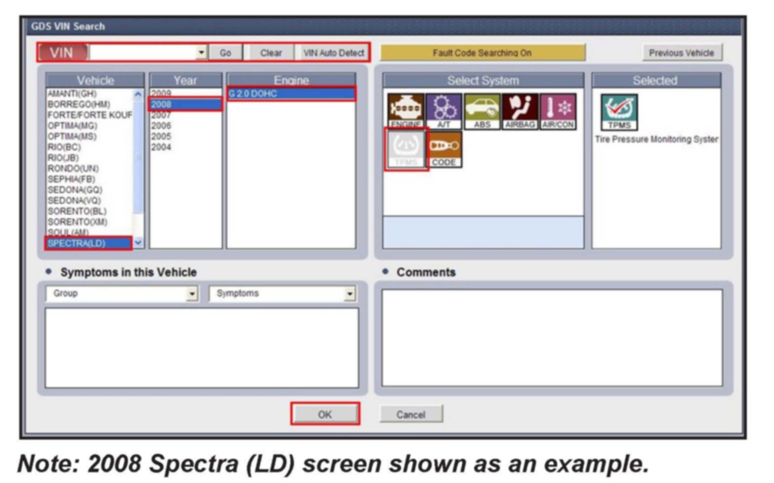 Enter the vehicle information by pressing the VIN Auto Detect button, entering the vehicle's VIN or selecting the vehicle model, model year, engine/fuel type and TPMS as the system and then click ok.