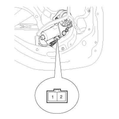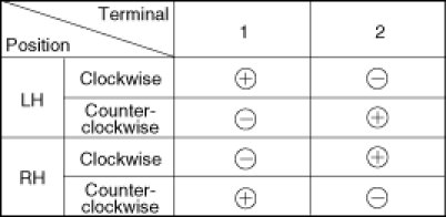 3. Connect the motor terminals directly to battery voltage (12V) and check that the motor operates smoothly. Next, reverse the polarity and check that the motor operates smoothly in the reverse direction. If the operation is abnormal, replace the motor.