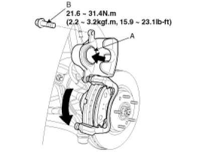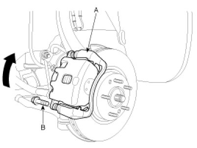 2. Remove the guide rod bolt(B), After raise the caliper assembly(A), support it with a wire.