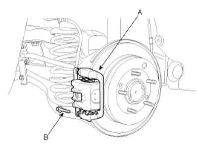 2. Remove the guide rod bolt (B), then raise the caliper assembly (A), and support it with a wire.