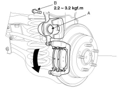 6. Pivot caliper down into position. Being careful not to damage the pin boot, install the guide rod bolt (B) and torque it to proper specification