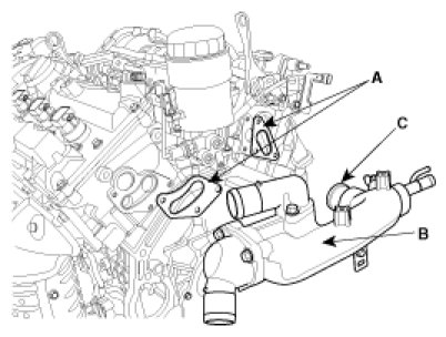 1. Install water temperature control assembly(B) and new gasket(A).
