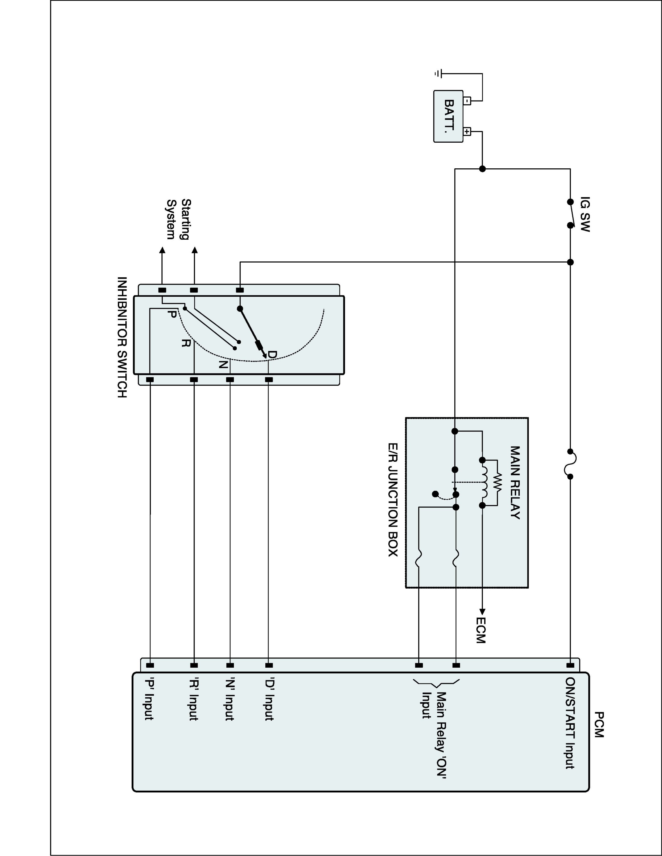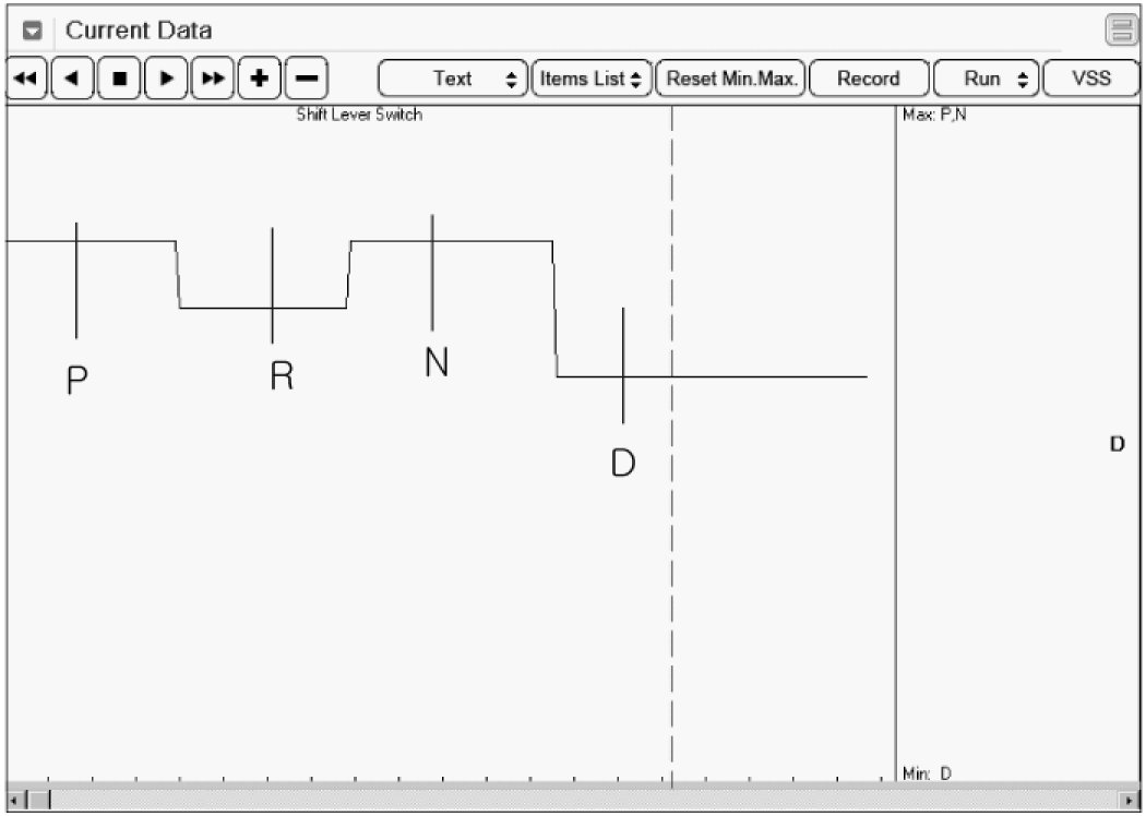 The Transaxle Range Switch sends the shift lever position information to the TCM using a 12V (battery voltage) signal. When the shift lever is in the D (Drive) position the output signal of Tansaxle Range Switch is 12V and in all other positions the voltage is 0V. The TCM judges the shift lever position by reading all signals, for the Transaxle Range Switch, simultaneously.