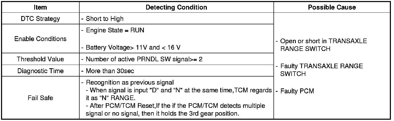 The TCM sets this code when the Transaxle Range Switch outputs multiple signals for more than 30 seconds.