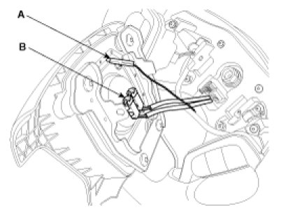 4. Release the connector locking pin, then disconnect the driver airbag module connector(B).