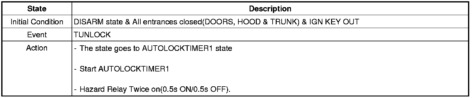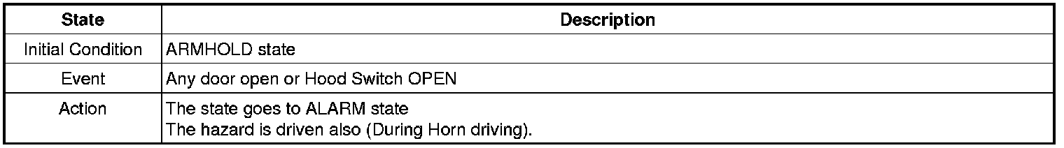 When the system is set off, the alarm (horn) sounds and the hazard lamp flash for about two minutes or until the system is disarmed by unlocking the transmitter.