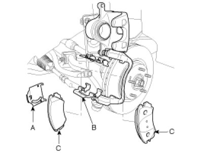 2. Remove the pad shims (A), pad retainers (B) and pads (C).