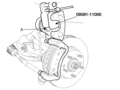 4. Push in the piston (A) using the SST(09581-11000) so that the caliper will fit over the pads. Make sure that the piston boot is in position to prevent damaging it when pivoting the caliper down.