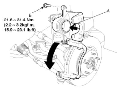 1. Remove guide rod bolt (B) and raise the caliper (A).Check the hoses and pin boots for damage and deterioration.