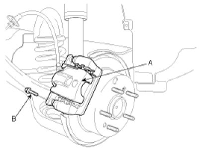 5. Remove the caliper bracket (B) and the caliper mounting bolts (A).