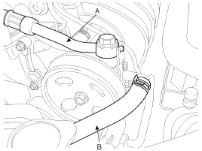 2. Disconnect the pressure tube (A) and suction tube (B) from the power steering oil pump.