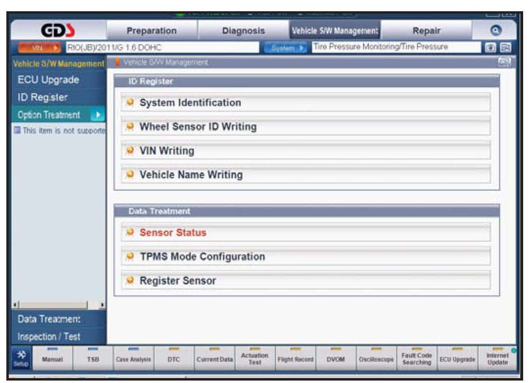 The TPMS Sensor ID can be registered automatically (using the GDS TPMS module) by going to "Register Sensor" function under "Data Treatment."