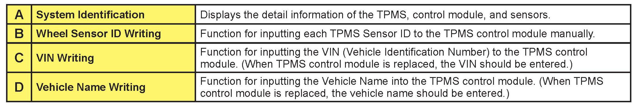 When the TPMS control module or the TPMS sensor is replaced, the TPMS sensor ID could be registered using this function for the TPMS system to operate properly.