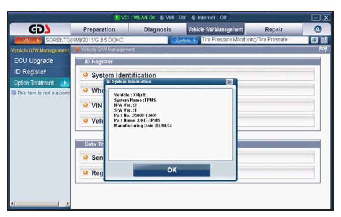 Using the System Identification, the Vehicle Name, Part Number, Part Name, Programming Date, Software Version, Hardware Version, and Stored Sensor ID will be displayed