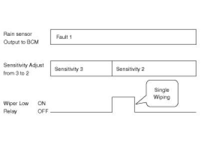 4. The drive may adjust the rain sensor performance by adjusting the sensitivity input. When in automatic mode, the BCM will perform a single wipe each time the sensitivity is adjusted upward to a more sensitive setting (downward more then one step). This single wipe will only be performed if Rain Detected signal is being received from the Rain sensor. If the sensitivity adjustment is adjusted upward more than one sensitivity, the BCM will only perform a single wipe unless the time between Increases is more than 2 seconds.