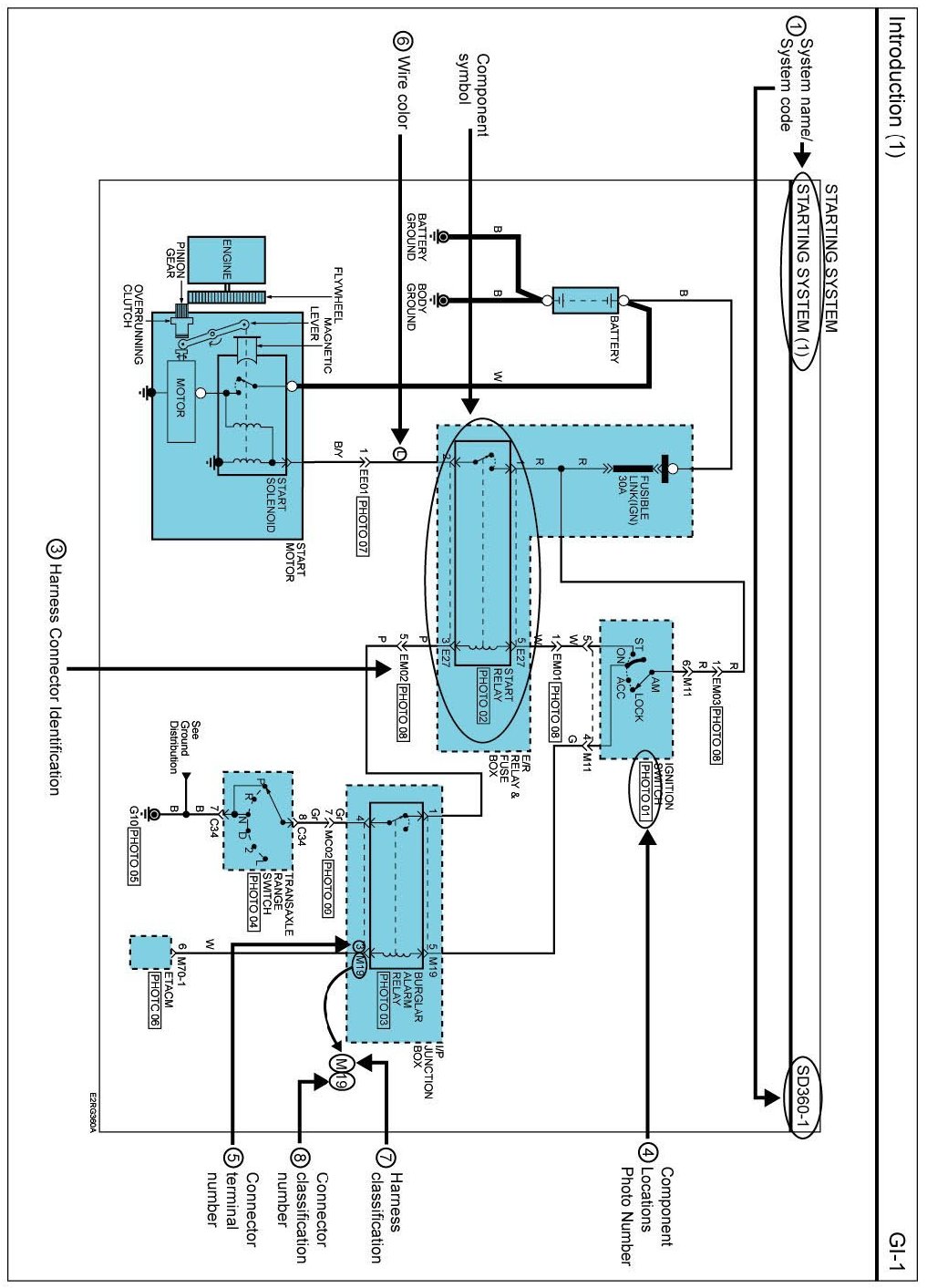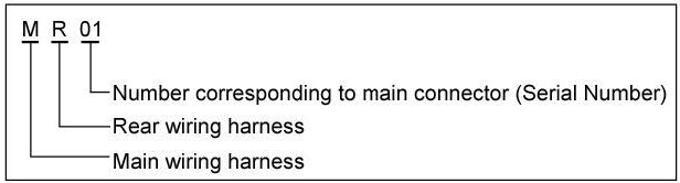 A connector identification symbol consists of a wiring harness location classification symbol corresponding to a wiring harness location and number corresponding to the connector.