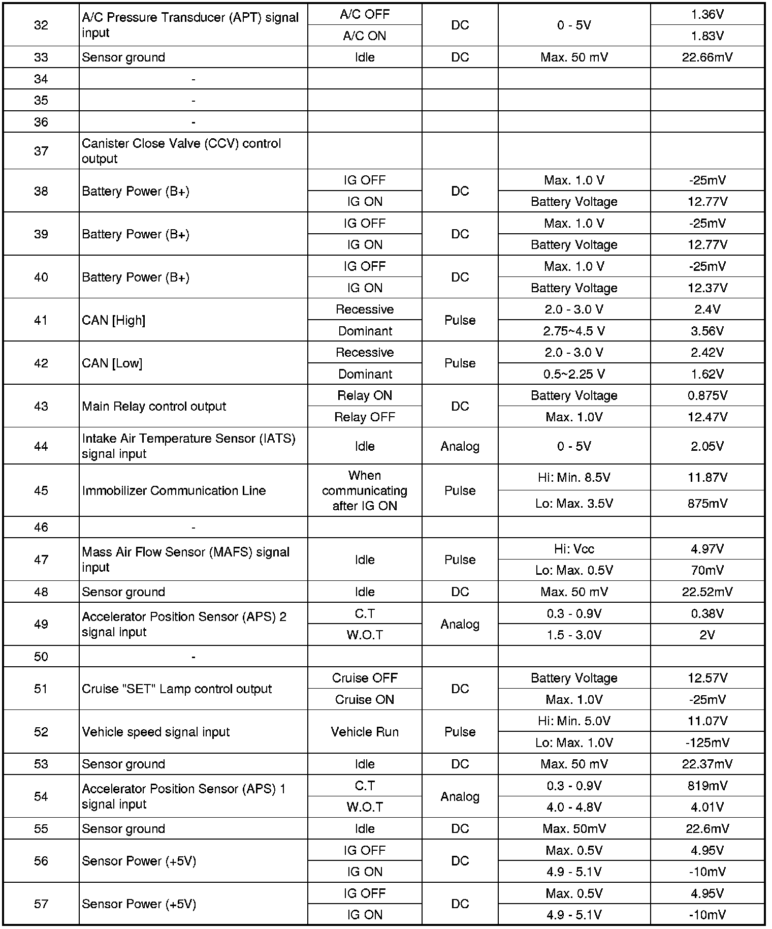 Pinout Values and Diagnostic Parameters