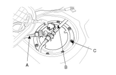 3. Unscrew the fuel pump mounting bolts (C) and remove the fuel pump assembly.