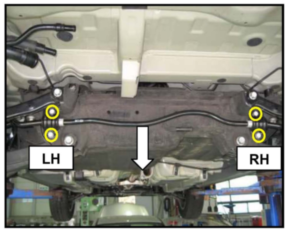 5. Remove the four (4) 14 mm rear stabilizer bar mounting bolts on both sides, and then let the rear stabilizer bar hang down.