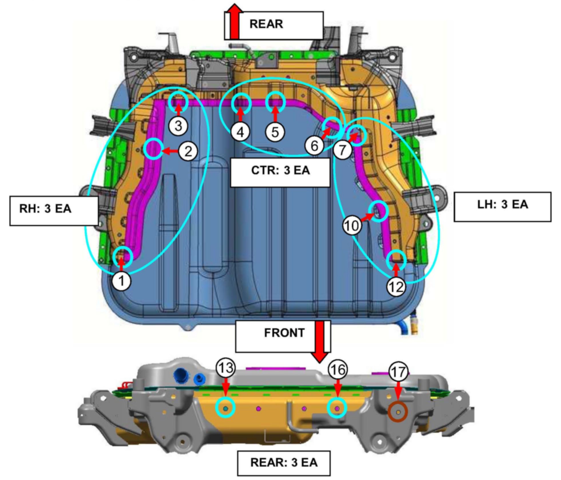 20. Spray cavity wax through three (3) rear openings (13, 16 and 17).