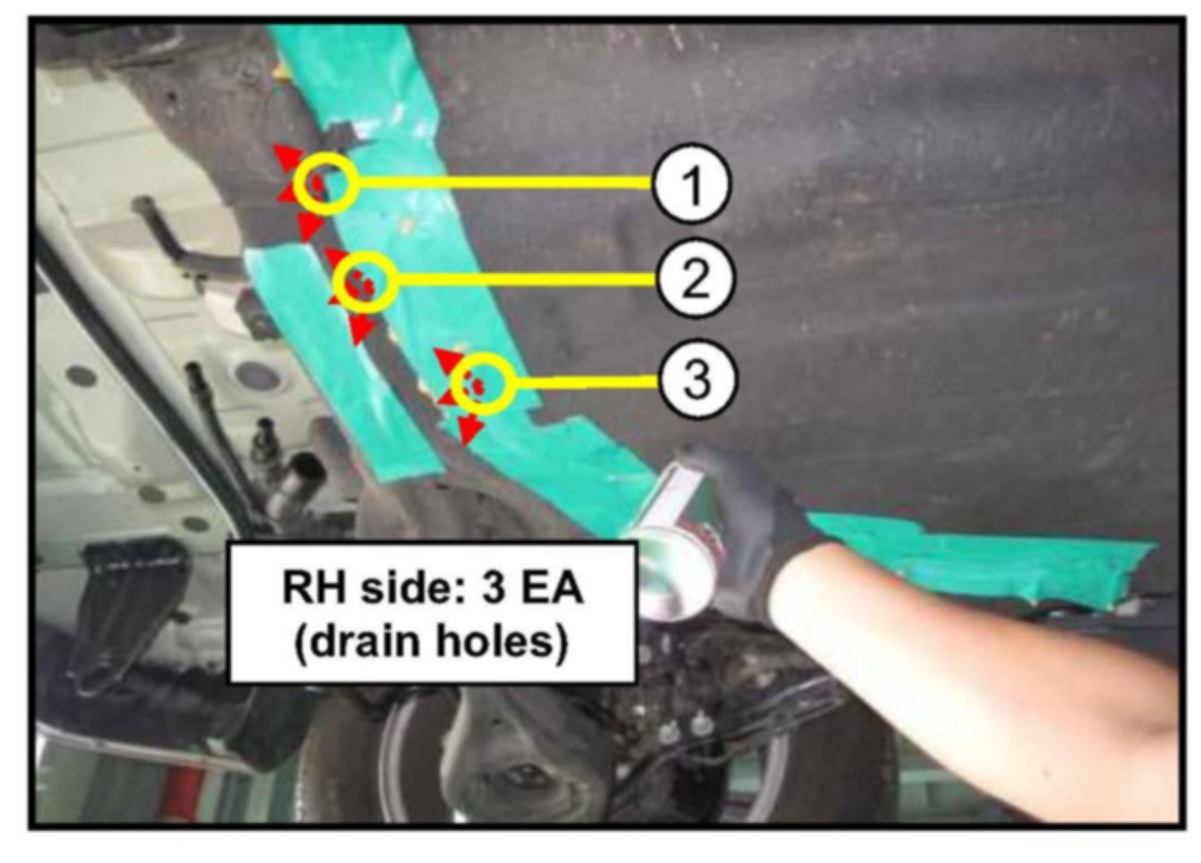 Before spraying cavity wax, block the (LH, RH and Center) drain openings (used for blowing out foreign materials and debris in the previous procedure) as shown in the photo using the tape supplied in the tool kit. This is to avoid wax from flowing down through the holes while spraying wax.