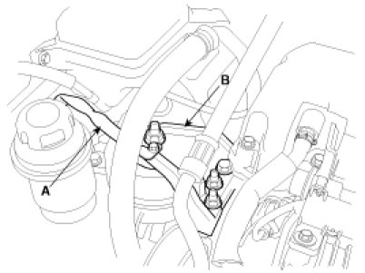 25. Install the engine mounting bracket (B) and ground line (A).