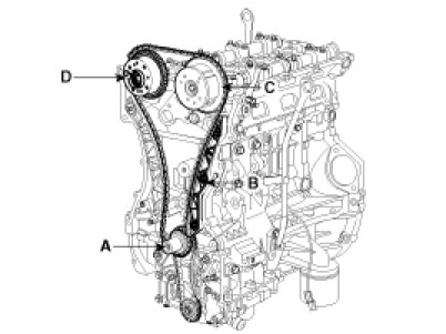 To install the timing chain with no slack between each shaft (cam, crank), follow the below procedure.Crankshaft sprocket (A) -> Timing chain guide (B) -> Intake camshaft sprocket (C) -> Exhaust camshaft sprocket (D).
