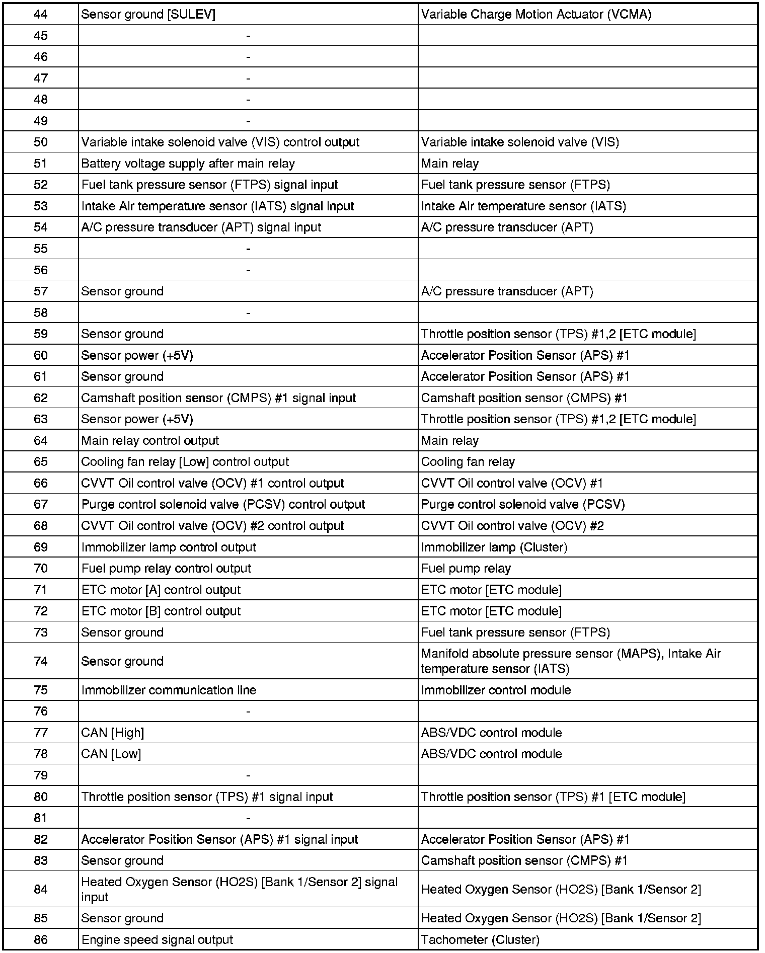 Pinout Values and Diagnostic Parameters