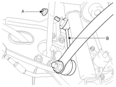 4. Disconnect the rear stabilizer link (B) with the trailing arm by loosening the nut (A).