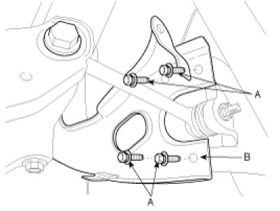 5. Install the wheel speed sensor and parking brake cable bracket by tightening the mounting bolts (A, B).