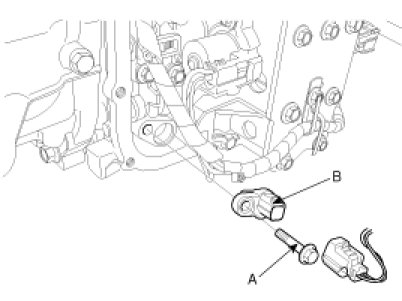 4. Remove the oil temperature sensor(B), loosening the mounting bolt(A).