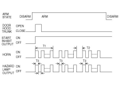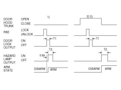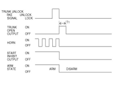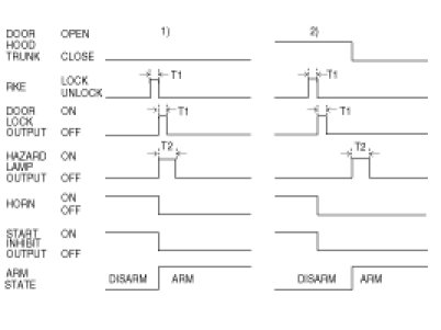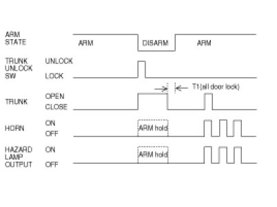 (3) When trunk key UNLOCK occurs, the horn, hazard lamp and start inhibitor will be off, however alarm on hold mode is on and the ARM state for other entry ports remains activated. (If the trunk is closed and remains closed for more than 2 seconds, a door lock check will occur and the Anti-Theft system will ARM. Also, if any door is unlocked a LOCK sequence will occur.)