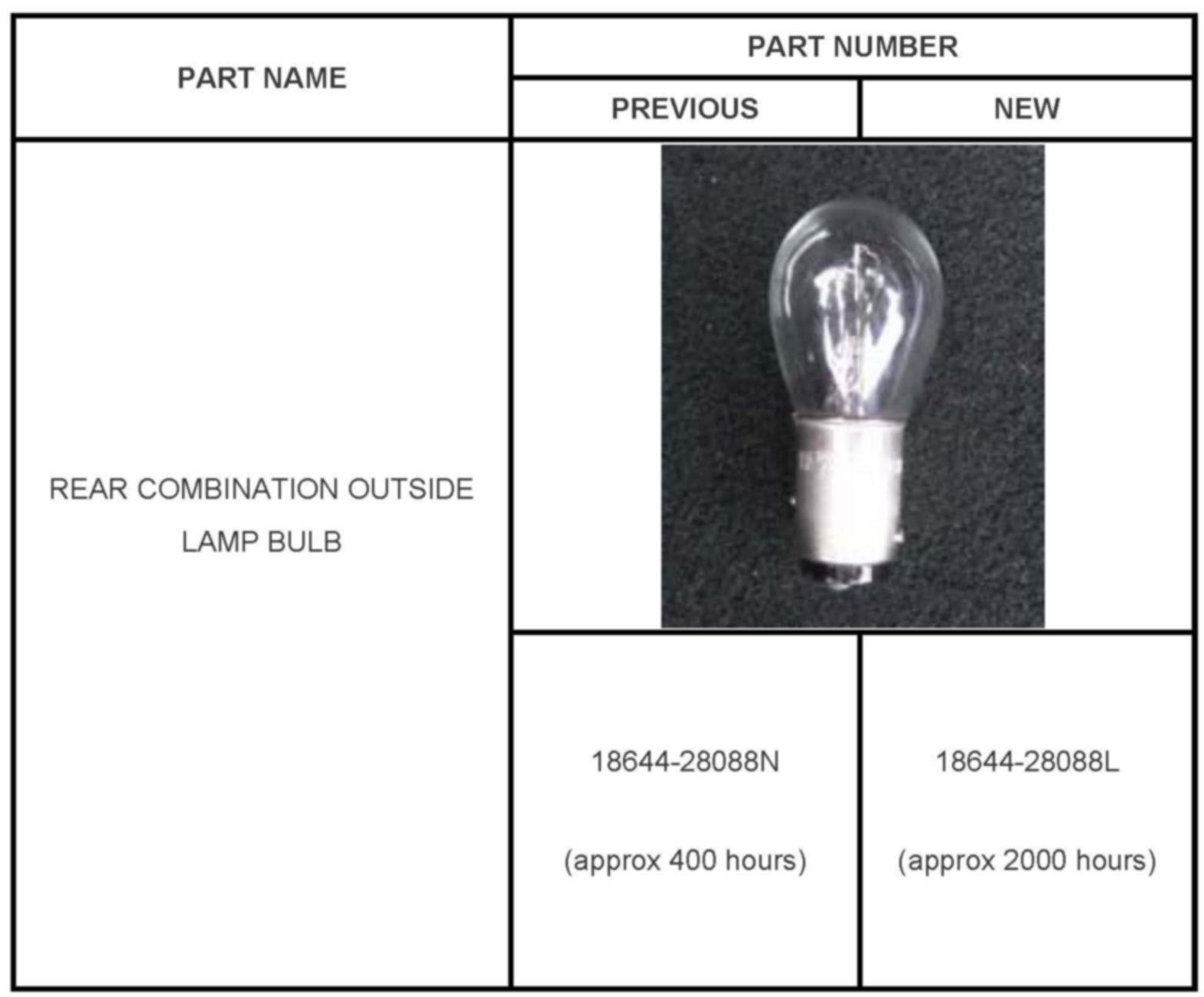 This Pitstop article provides information relating to the improved durability of bulb life for part number 18644 28088N (Rear Combination Bulb: Rear Stop Lamp/Tail Lamp Bulb) utilized on multiple Kia models. Part number 18644 28088N has a bulb life of approximately 400 hours, the new replacement bulb part number 18644 28088L has a bulb life of approximately 2000 hours (long life bulb). Kia has already phased this change from the factory for part number 18644 28088L on the current model line(s). In the event that the old part number 18644 28088N is in need of replacement, both the left/right-hand rear combination bulbs should be replaced together with part number 18644 28088L (Long Life). Failure to replace the rear combination lamps together could cause customer complaints for multiple repairs and bulb replacements.
