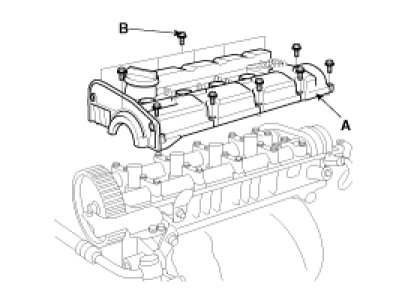 10. Remove the four bolts (B) and timing belt upper cover (A).