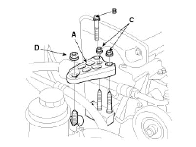 (2) Remove the bolt(B), three nuts(C, D) and engine mount bracket (A).