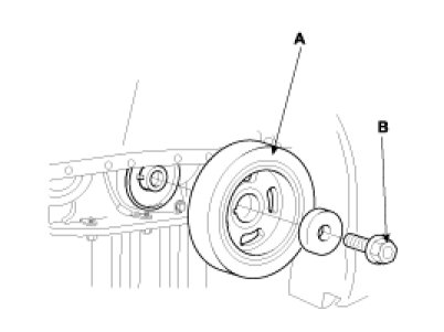 12. Remove the crankshaft pulley bolt (B) and crankshaft pulley (A).