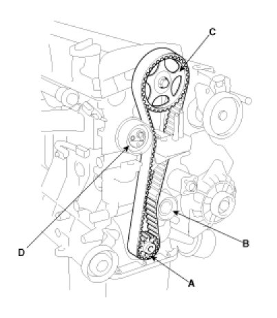 Crankshaft sprocket (A) -> Idler pulley (B) -> Camshaft sprocket (C) -> timing belt tensioner (D).