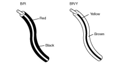 Two-color wires are indicated by a two-color code symbol. The first color indicates the base color of the wire; the second color indicates the color of the stripe.