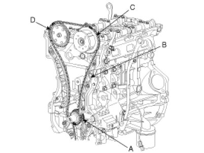 Crankshaft sprocket (A) -> Timing chain guide (B) -> Intake CVVT sprocket (C) -> Exhaust CVVT sprocket or camshaft sprocket (D).