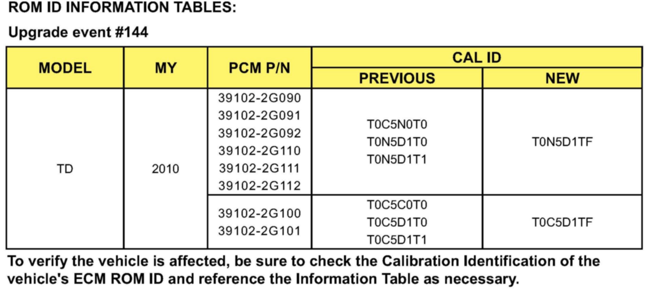To verify the vehicle is affected, be sure to check the Calibration Identification of the vehicle's ECM ROM ID and reference the Information Table as necessary.