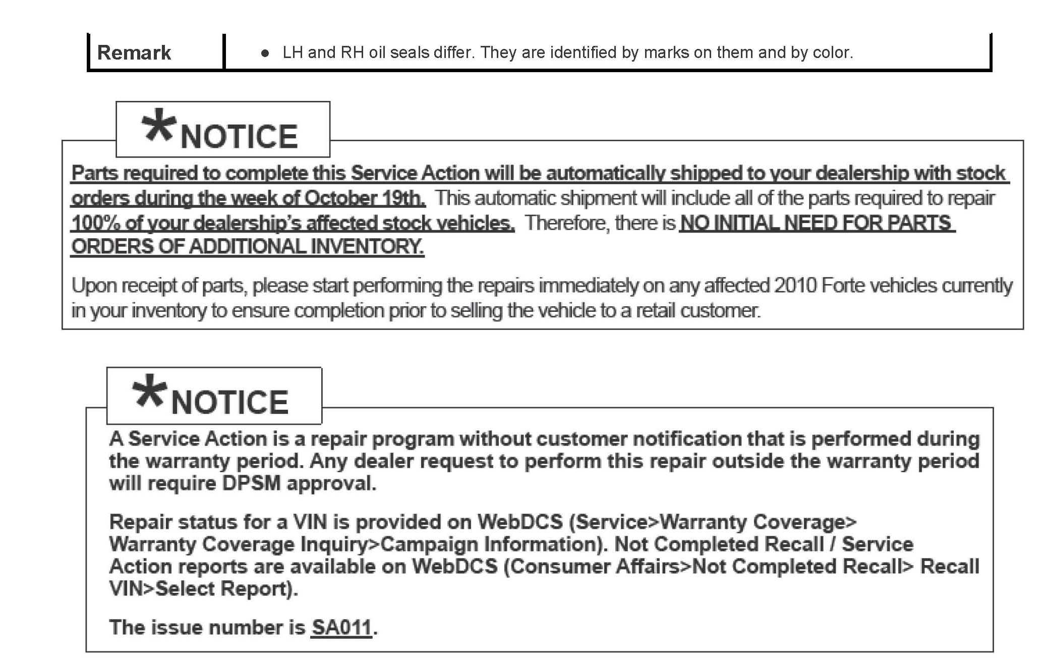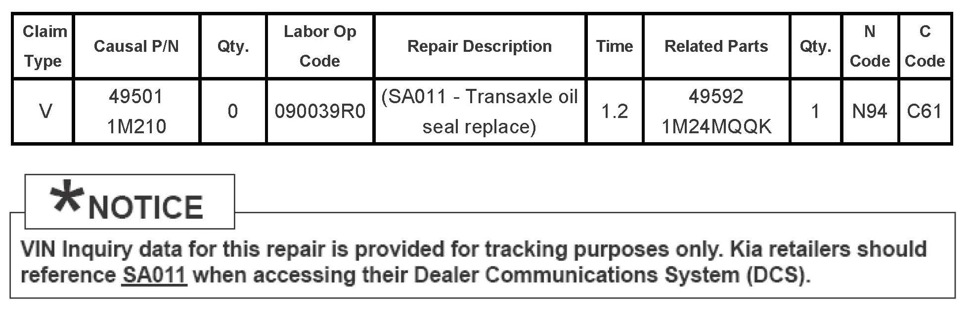 Campaign SA011 - M/T Driveshaft Housing/Seal Inspection