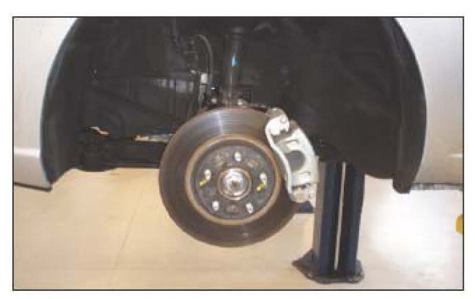 1. Safely support the vehicle and remove the left front wheel and tire assembly as shown.